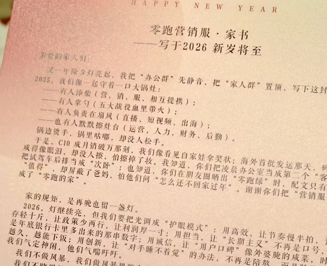 2026年2月5日,零跑汽车首席运营官(COO)徐军在微博晒出“写给零跑营销服的家书”,明确提到2026年销量目标为105万台,并强硬表示“多一台算我输”,凸显企业信心与决心。