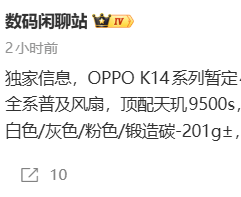 2026年2月5日,据博主“数码闲聊站”爆料,OPPO K14系列暂定2026年4月前后发布。该机提供6.59英寸与6.78英寸双屏幕版本,顶配版本搭载联发科天玑9500s处理器,全系标配离心风扇主动散热。