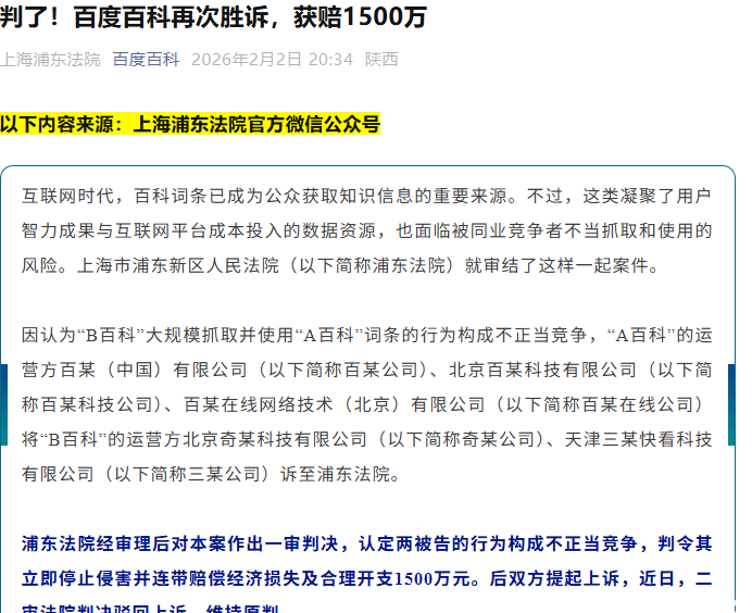 2026年2月3日消息,昨日,百度百科公众号转发上海市浦东法院《百科词条遭同业竞争者抓取使用,法院判赔1500万》一文。