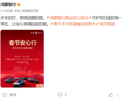 2026年2月3日,鸿蒙智行官方正式宣布推出“春节安心行”活动,宣称“春节不打烊”,为问界、智界、享界、尊界、尚界全系已交付车主提供出行安全检测、道路救援、门店运营等服务。活动时间为2026年2月4日至3月3日。
