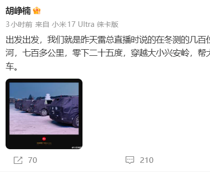2026年2月2日,顺为资本投资合伙人胡峥楠在微博发布了一组小米伪装测试车在高寒地区的实勘图,配文“从漠河到黑河,七百多公里,零下二十五度,穿越大小兴安岭,帮大家好好试一下‘都在等着的车’”。