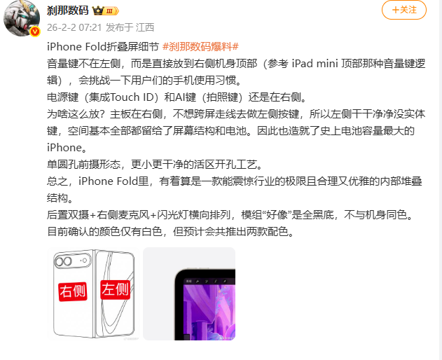 2026年2月2日,博主“刹那数码”爆料称,基于对机身内部结构的优化考量,苹果iPhone Fold折叠屏手机音量键将不在置于左侧,而是直接放到右侧机身顶部。