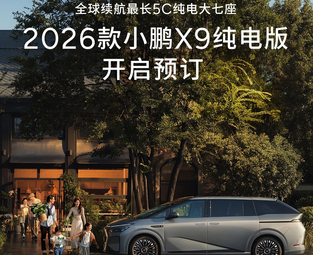 2026款小鹏X9纯电版正式开启预订,即日起至上市日(含)前,支付2000元意向金的用户可抵扣7000元购车款,且该权益可与上市权益叠加使用。