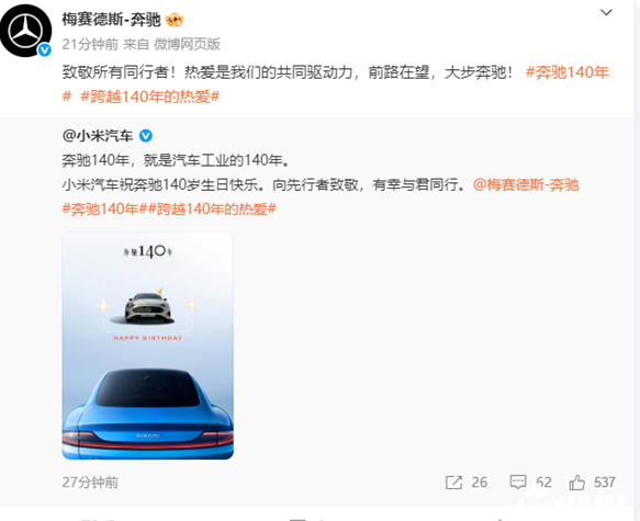 2026年1月29日,迎来了梅赛德斯 - 奔驰品牌创立140周年纪念日,梅赛德斯 - 奔驰官方于早间发文,回顾品牌百年发展历程,同时抒发对开启全新美好未来的期许。