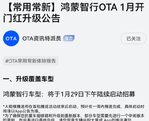 2026年1月29日,鸿蒙智行正式官宣问界系列1月开门红版本OTA升级招募将于今日下午启动,覆盖问界全系车型。
