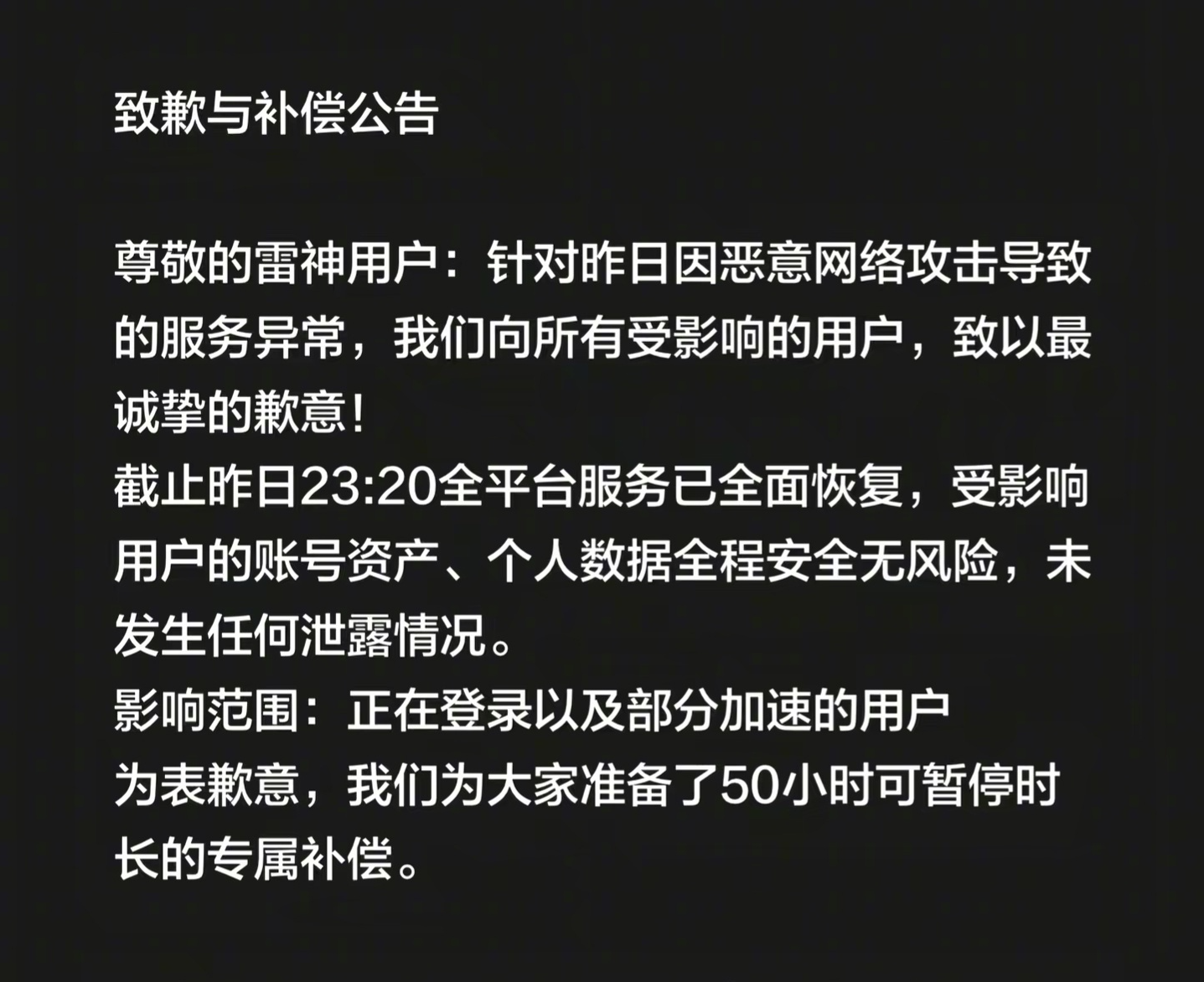 PChome 3月23日消息,雷神加速器因3月21日遭遇恶意网络攻击导致服务大规模中断,已向受影响用户发放50小时可暂停时长补偿,并承诺升级安全防护体系。