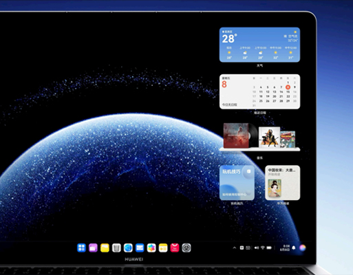 鸿蒙电脑的操作界面与鸿蒙Pad类似,底部为Dock栏,左上角为应用快捷图标,右侧为小组件,右下角为快捷操作按钮。