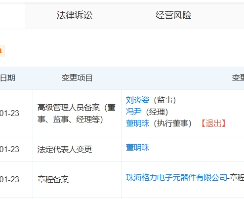 2026年1月26日,天眼查工商信息显示,珠海格力电子元器件有限公司发生重要工商变更,董明珠卸任公司法定代表人、执行董事职务,上述职务由方祥建接任,并同时担任执行公司事务的董事。