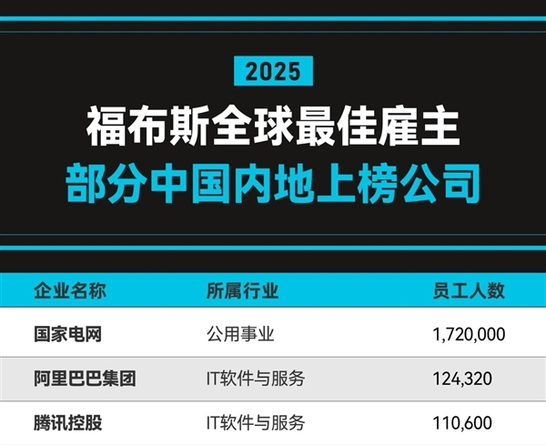 10月9日,《福布斯》联合Statista发布2025全球最佳雇主榜单,53家中国内地企业入围,其中国家电网、阿里巴巴、腾讯分列中国内地前三,全球排名依次为第99、143、155位,展现中国企业在人才管理领域的显著进步。