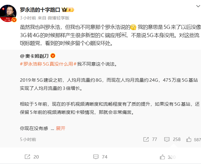 12月2日,产品经理、产品设计师罗永浩(微博账号“罗永浩的十字路口”)回应“罗永浩称5G真没什么用”的相关话题。