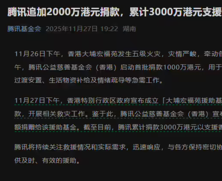 11月26日下午,香港新界大埔宏福苑发生五级火灾,火势波及7座住宅楼,救援工作持续推进。11月27日,腾讯公益慈善基金会(香港)宣布追加2000万港元捐款,累计捐款达3000万港元,全力支援救灾及善后工作。