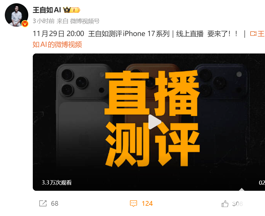 11月27日,ZEALER创始人王自如今天发文宣布,将于“王自如测评iPhone 17系列|线上直播”将于11月29日20:00开启。