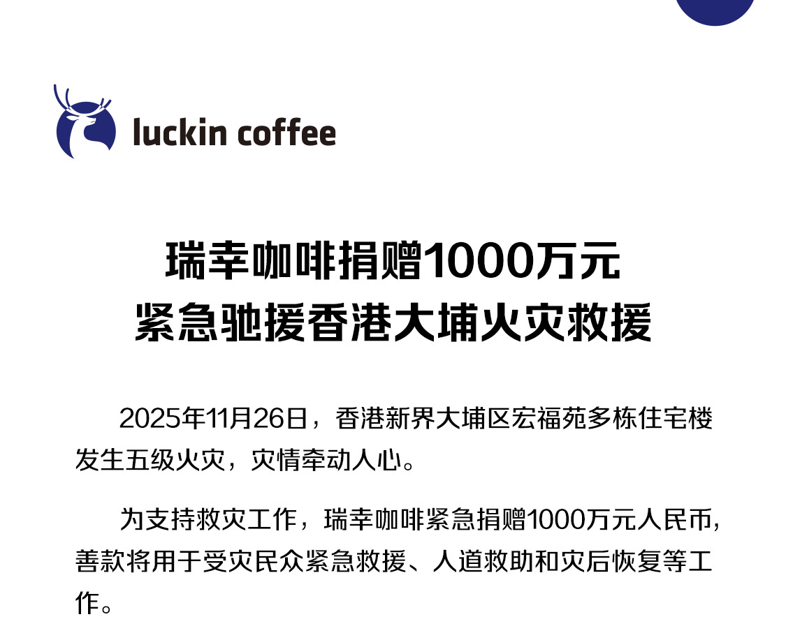 2025年11月28日,瑞幸咖啡捐款1000万元人民币,驰援中国香港大埔火灾救援,善款将用于受灾民众紧急救援、人道救助和灾后恢复等工作。