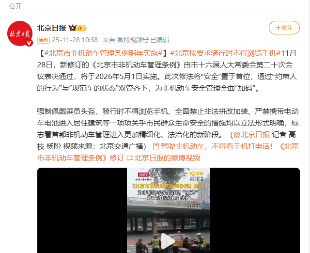 2025年11月28日,据北京日报消息,新修订的《北京市非机动车管理条例》由市十六届人大常委会第二十次会议表决通过,将于2026年5月1日实施。