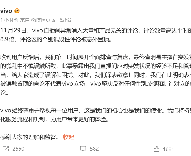 12月1日,vivo就官方直播间出现性别歧视评论被置顶事件作出正式回应,明确表示系运营人员误触导致个别诋毁性评论置顶,公司坚决反对任何形式的性别歧视和制造对立言论,已启动内部核查并向用户致歉。
