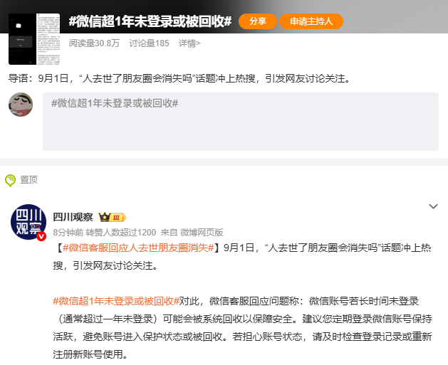 9月2日,近日,“人去世了朋友圈会消失吗”的话题冲上热搜。微信客服对此回应:若微信账号长时间未登录(通常超一年未登录),系统可能会将其回收,以保障安全,具体回收时间会依账号使用情况综合判定。