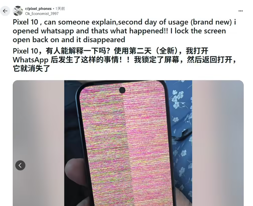 9月2日,据科技媒体Android Authority报道称,近日部分新购入谷歌Pixel 10系列手机的用户反馈出现“花屏”现象。具体表现为屏幕突然出现彩色雪花状干扰图案,但设备整体依旧保持正常响应,几分钟后屏幕会自动恢复。