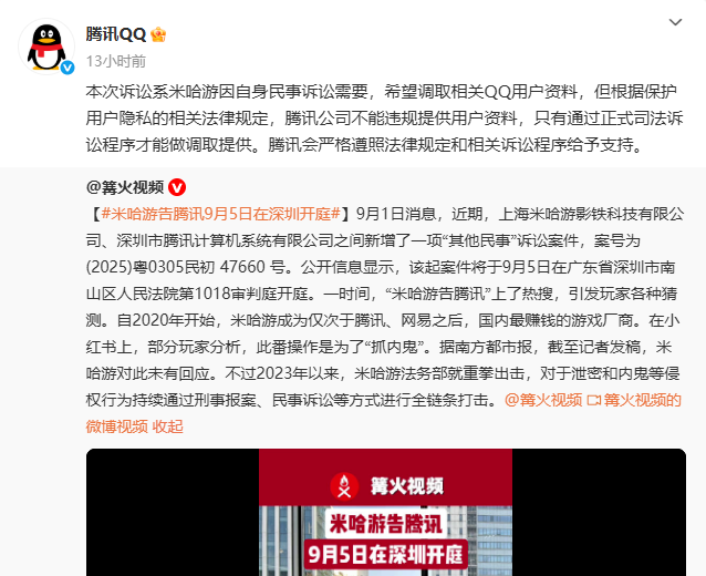 9月2日,昨日深夜针对“米哈游告腾讯”引发的热议,腾讯方面给出正式回应。此次诉讼源于米哈游因自身民事诉讼需求,期望获取相关QQ用户资料。