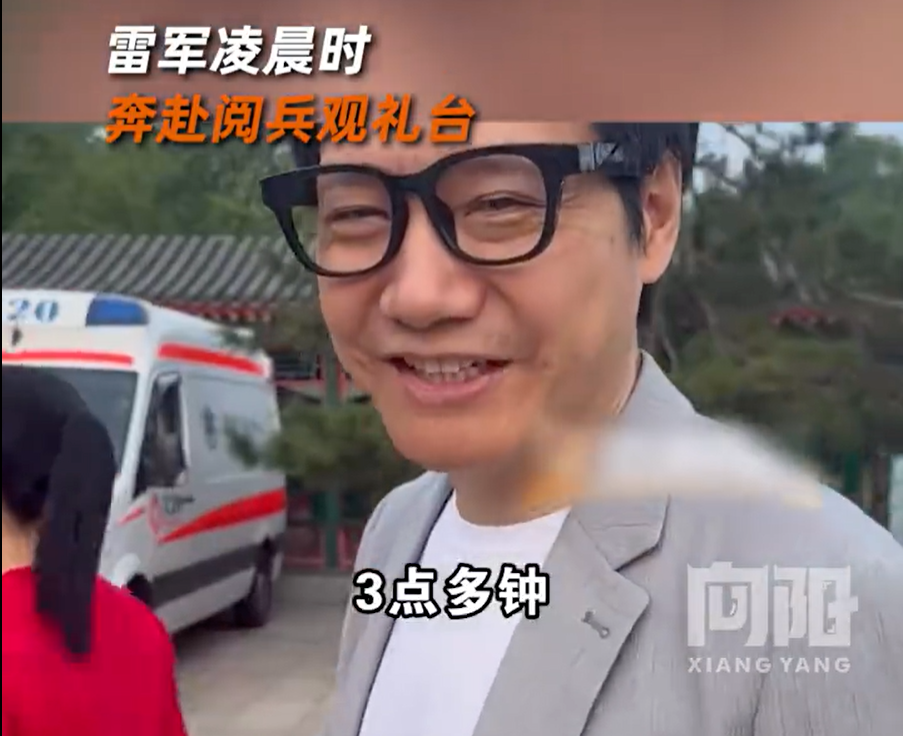 9月3日,据向阳视频今日报道,小米创办人,董事长兼CEO雷军也受邀前往现场参加观看阅兵仪式。雷军被问及出发时间时,他表示是在凌晨三点多动身的。