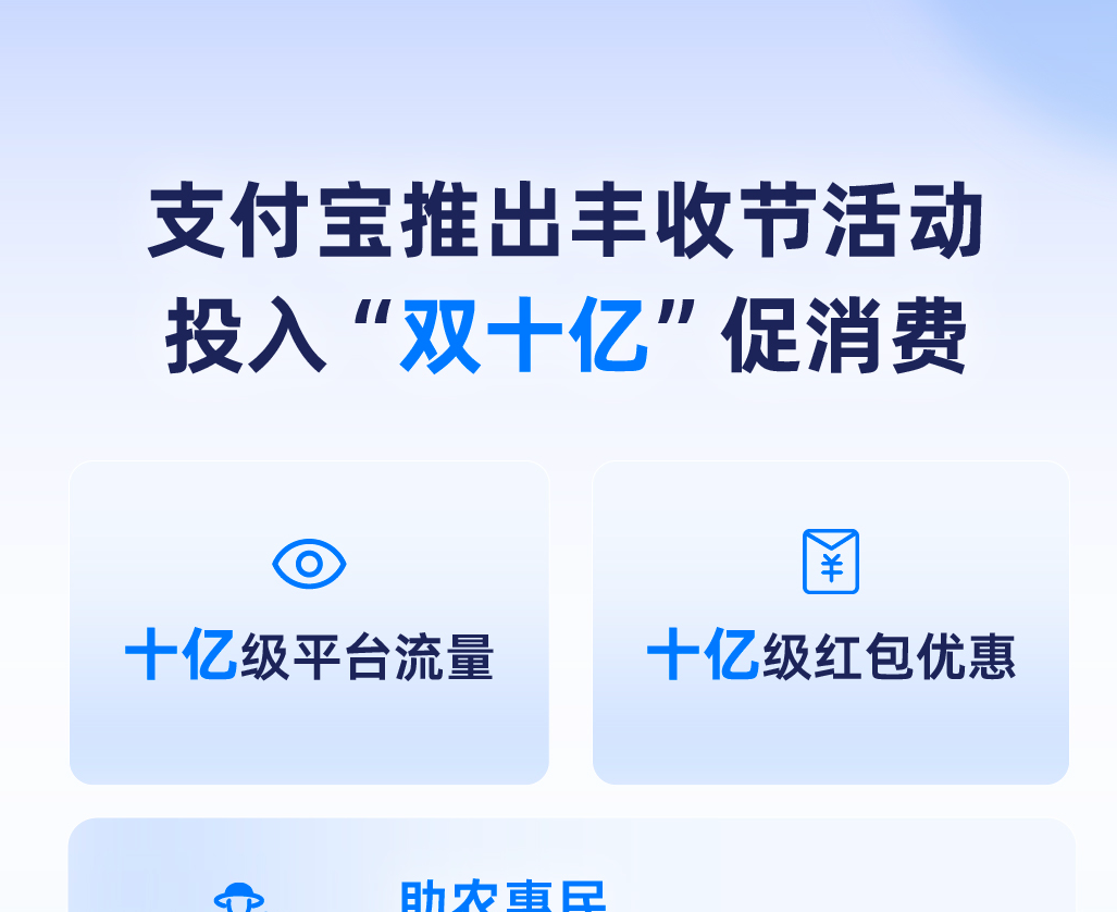 9月1日,支付宝在9月1日至9月7日正式推出丰收节活动,投入“双十亿”促销费,在金秋消费旺季为消费者与商家送上重磅福利。
