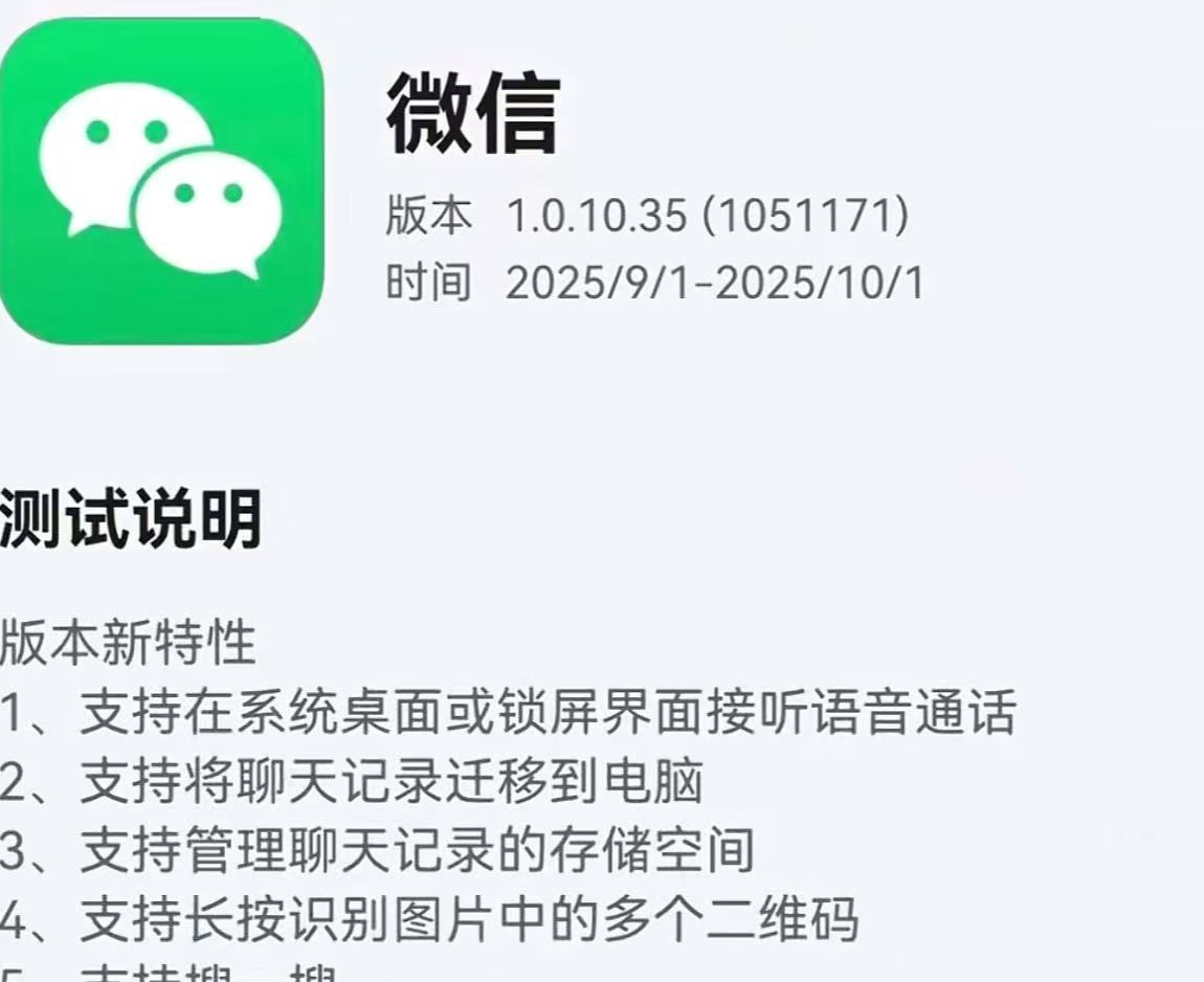 9月1日晚,微信鸿蒙版App在华为应用市场开启1.0.10.35(1051171)版本邀测升级,测试时周期为2025年9月1日至10月1日。该版本仍为邀请制内测,用户需收到短信通知后,通过指定链接参与内测。