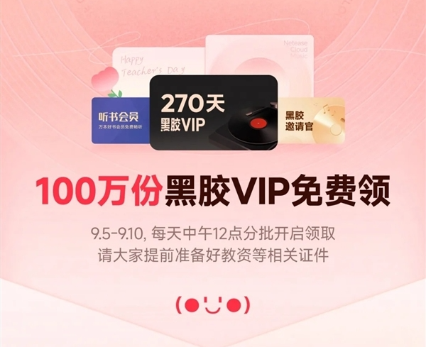 近日,在第四十一个教师节来临之际,网易云音乐宣布将于9月5日至10日开展教师节特别活动,面向全国教师群体发放100万份专属数字礼包。