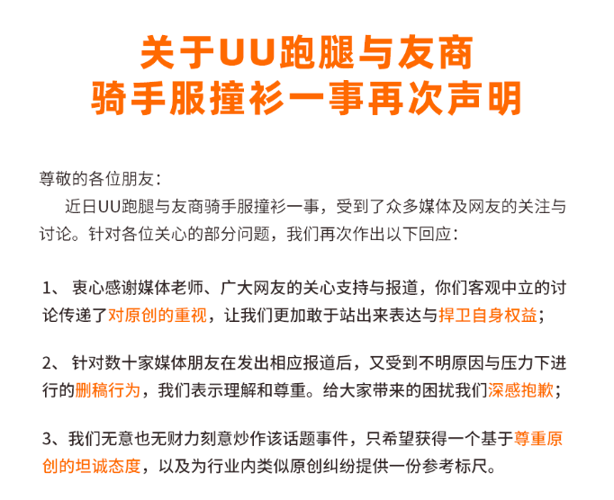 9月2日,UU跑腿与淘宝闪购骑手服“撞衫”一事持续引发关注。今日,UU跑腿设计团队发布《关于UU跑腿与友商骑手服撞衫一事再次声明》。