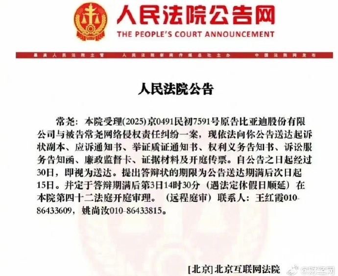 8月27日,汽车行业一则诉讼消息引发广泛关注。据财经网报道,比亚迪已就网络侵权责任纠纷,对坦克品牌CEO常尧提起诉讼。由于无法联系到常尧本人,法院已启动公告送达程序,并将于9月21日开庭审理。