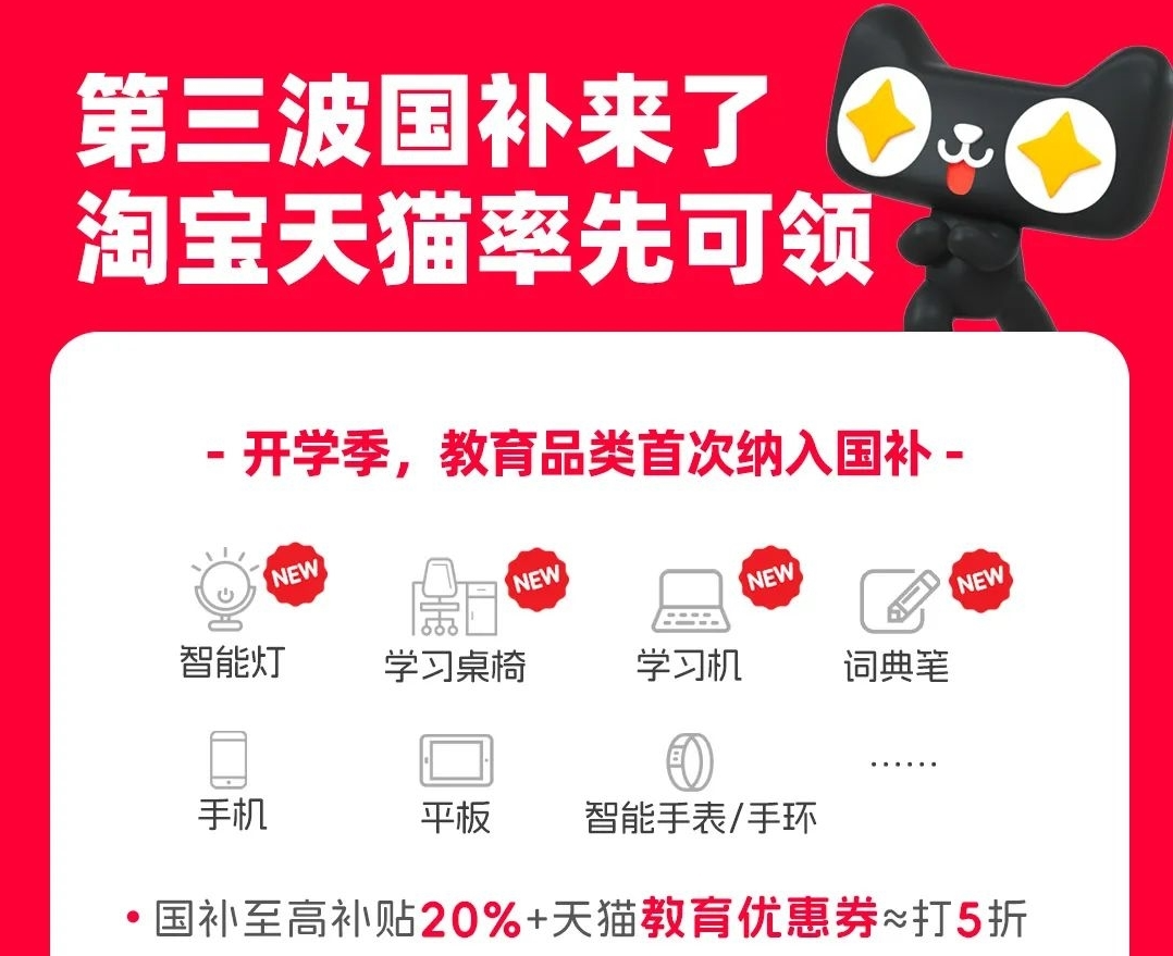 8月27日,据封面新闻今日报道,国家以旧换新第三批资金已下达。即日起,淘宝天猫率先开启申领通道。用户通过淘宝APP首页或者搜索“国家补贴”,即可进入国补专区,领用相关补贴。