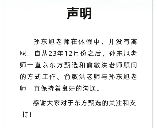 8月22日晚,东方甄选官方微博发布声明,明确表示孙东旭老师并未离职,只是照例休假。有知情人士透露,“孙东旭每年夏天都会休假陪伴家人,今年只是照例休假。目前其没有任何离职计划,休假结束后将正常返岗。”