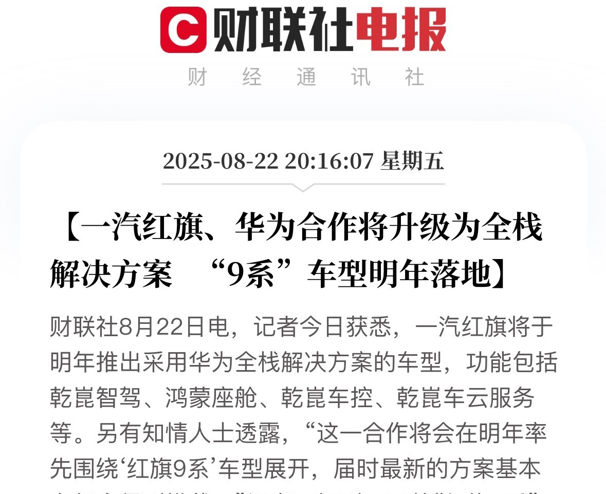 8月22日,据财联社报道,一汽红旗计划在2026年推出的新车型中搭载华为全栈解决方案,该方案覆盖智能汽车核心功能,具体包含乾崑智驾系统、鸿蒙智能座舱、乾崑车控系统和乾崑车云服务等关键模块。