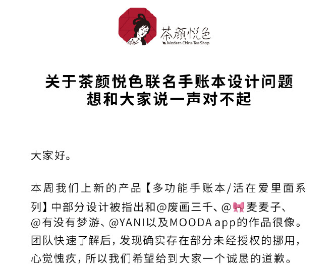 8月25日,茶颜悦色在昨日就联名手账本涉抄袭风波发布声明致歉。此前,8月22日茶颜悦色与上海彩虹合唱团推出多款联名产品,其中手账本部分设计遭三名博主质疑抄袭,网友也指出其部分元素与MOODA App作品相似。