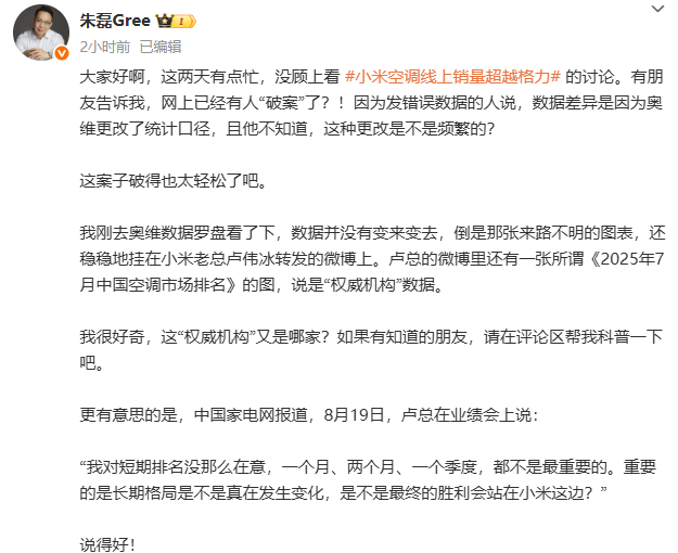 8月25日,珠海格力电器股份有限公司市场总监朱磊再次在社交媒体平台发文回应,此前与小米因空调销量排名产生争议一事。朱磊表示,奥维数据罗盘的数据并没有变来变去,空调行业需要真正的“长期主义”。