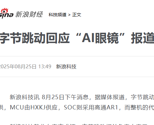 8月25日下午,据新浪科技报道,有媒体消息称,字节跳动即将发布一款AI眼镜。该产品方案由RXKJ提供,MCU(微控制单元)由HXKJ供应,SOC(系统级芯片)则采用高通AR1芯片,整机的代工则由LQKJ负责。