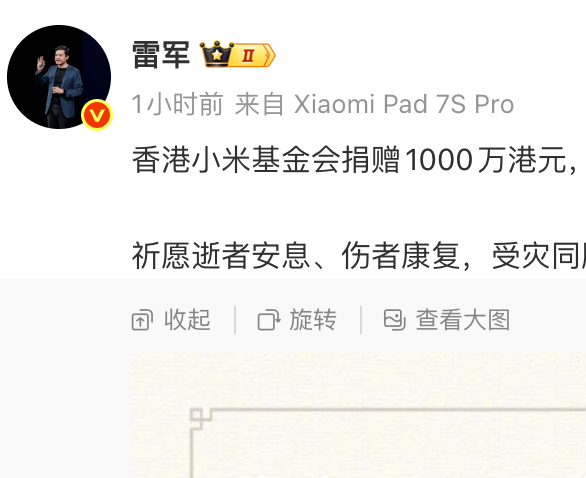 香港小米基金会捐赠1000万港元,紧急驰援香港大埔火灾救援,用于受灾居民的医疗救助、紧急安置、过渡期生活救助等救援工作。