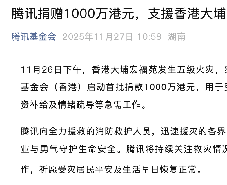 11月27日,腾讯基金会发文称,腾讯公益慈善基金会(香港)启动首批捐款1000万港元,用于受灾居民的紧急救援、过渡安置、生活物资补给及情绪疏导等急需工作。