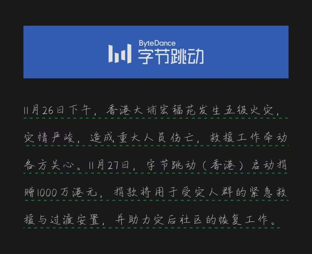 2025年11月27日,字节跳动宣布捐赠1000万港元,支持中国香港大埔火灾紧急救援,生活补给以及灾后重建。