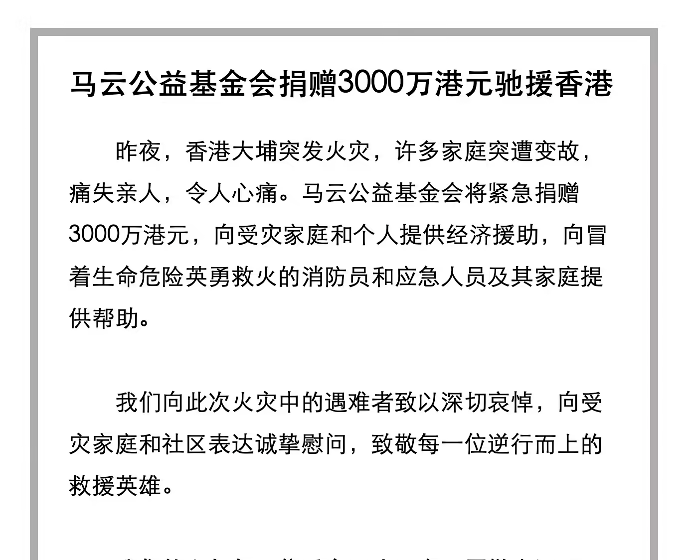 2025年11月27日,马云及阿里巴巴集团、蚂蚁集团总共捐款6000万港元,支持中国香港火灾救援。