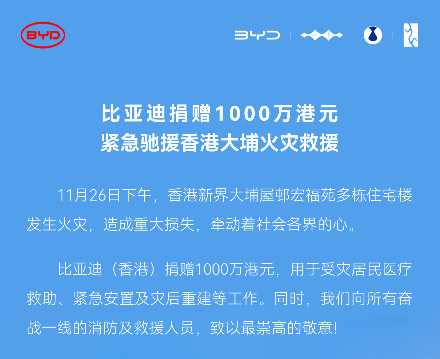 2025年11月27日,比亚迪集团总经理李云飞官宣,比亚迪捐款1000万港元,支持香港火灾救援。