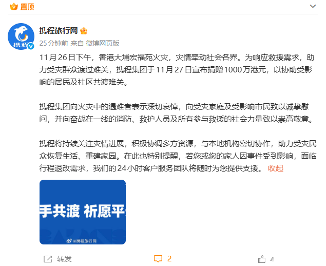 2025年11月27日,携程集团官宣捐款1000万港元,协助中国香港受影响的居民及社区共渡难关。