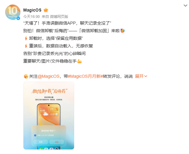2025年11月27日,荣耀MagicOS官方发布了“微信卸载加固”功能,允许用户在卸载微信时选择保留聊天记录、图片、文件等应用数据,重装后可自动恢复。