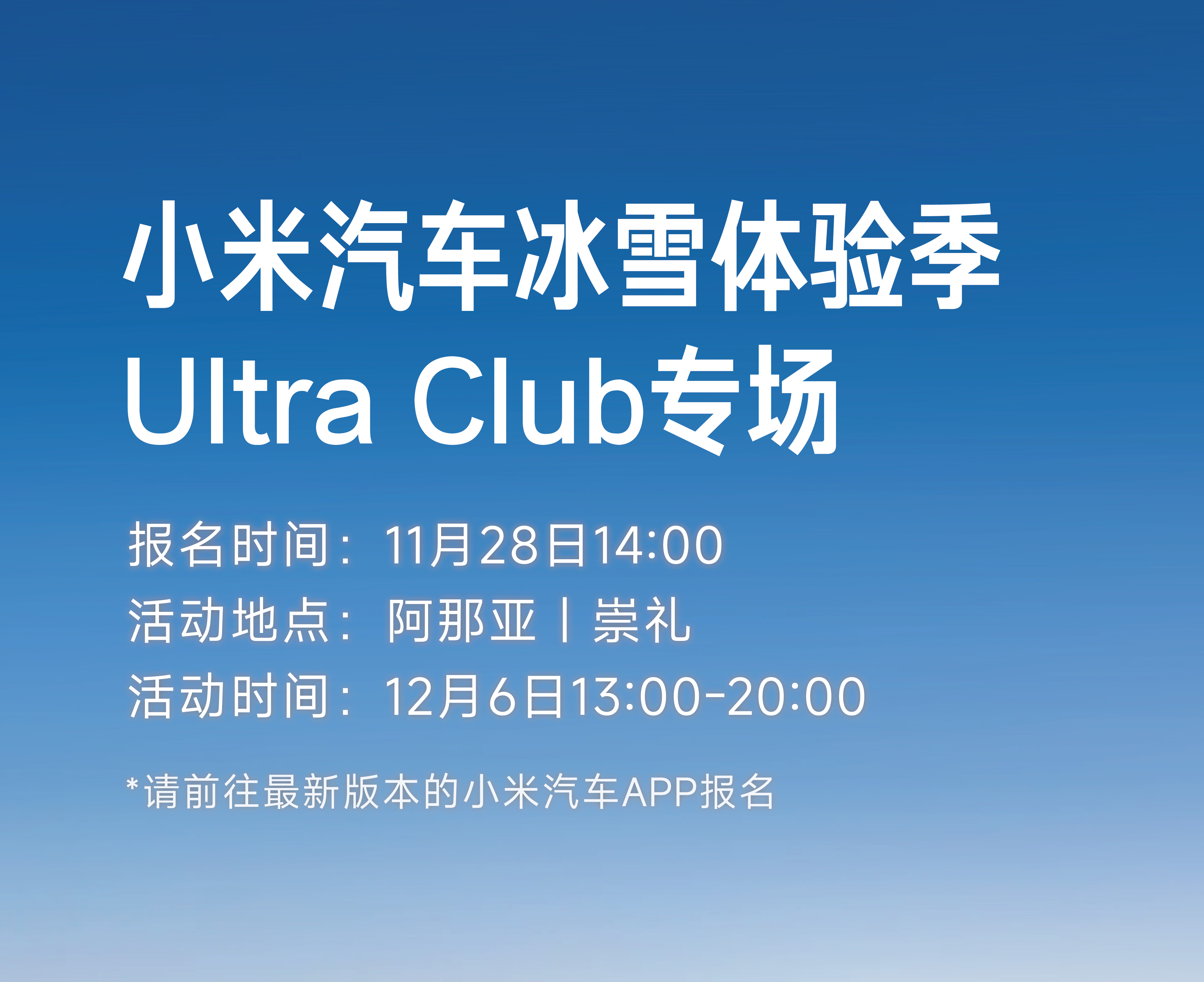 2025年11月27日,小米汽车官方微博发布,小米汽车冰雪体验季-Ultra Club专场,于11月28日下午14点面向Ultra Club会员开启报名,活动名额共22个,地点位于阿那亚·崇礼,费用包括报名费与住宿费两部分:报名费为249元(仅限Ultra Club专场),住宿费为1250元(需自行向酒店支付)。