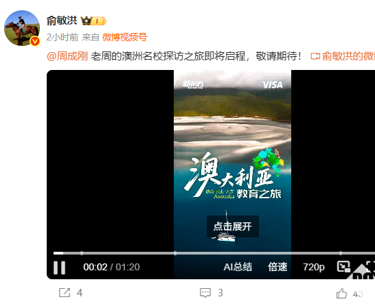8月20日,新东方教育集团有限公司董事长俞敏洪今日在社交媒体平台上为新东方CEO周成刚的新片《澳大利亚教育之旅》进行预热。俞敏洪表示:老周的澳洲名校探访之旅即将启程,敬请期待!
