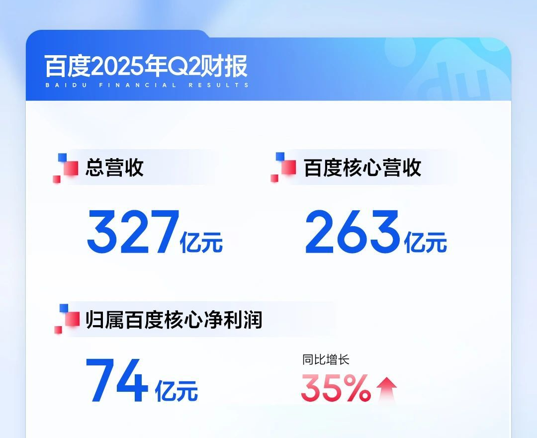 8月20日,百度官方今日发布了2025年Q2财报,二季度总营收327亿元,百度核心营收263亿元;归属百度核心的净利润为74亿元,同比增长35%,超出市场预期。