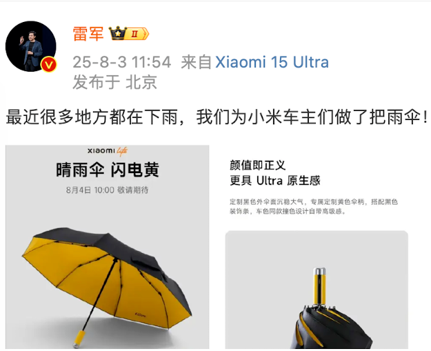 8月3日,小米集团创始人、董事长兼CEO雷军通过其个人微博宣布,针对近期多地降雨天气,小米专为SU7车主打造了一款定制晴雨伞产品。