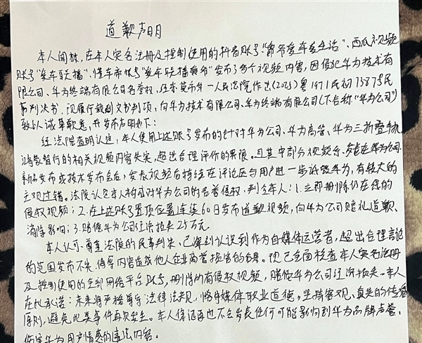 8月4日,有着10万粉丝的抖音博主“爵爷爱车爱生活”今日下午发布道歉声明。该博主在声明中表示,自己实名注册并控制使用多个账号发布了多个视频,因侵犯华为公司致以诚挚歉意。