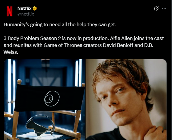 8月1日,网飞(Netflix)官方确认,科幻剧集《三体》第二季目前已正式进入拍摄阶段。
