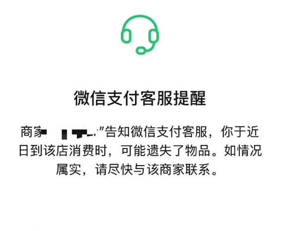 8月1日,有网友今日发文表示,自己在微信支付上收到了客服提醒:“商家‘XX’告知微信支付客服,你于近日到该店消费时,可能遗失了物品,如情况属实,请赶快与商家联系。”