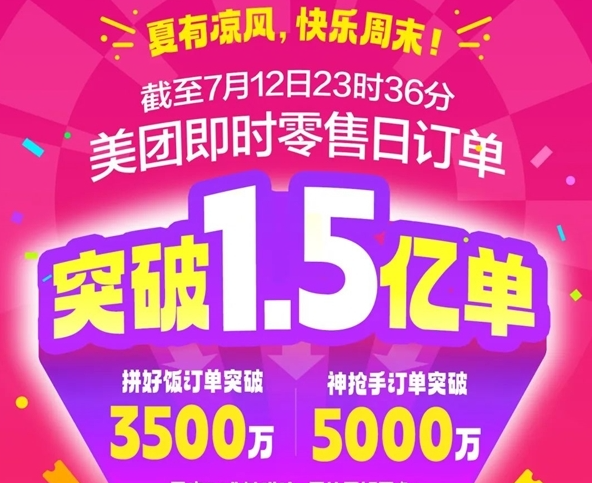 7月13日,美团官方宣布,7月12日23时36分,美团即时零售订单量再创新高,突破1.5亿单。其中,神抢手单量超5000万单,拼好饭单量超3500万单,且相关数字仍在持续增长。