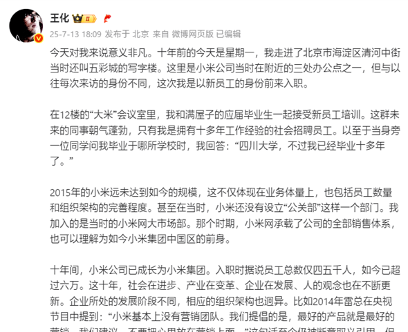 7月14日,昨晚小米公关部总经理王化发文,纪念他加入小米十周年,并回顾了这些年在小米的经历。小米创办人,董事长兼CEO雷军随后转发并感谢王化在这十年的工作和贡献。